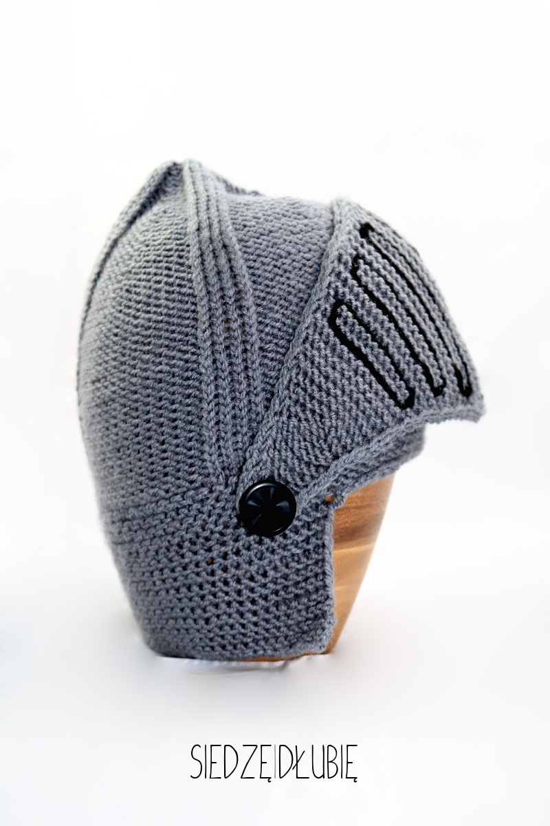 Nie jest to moja pierwsza tematyczna czapka. Kiedyś wydziergałam Dziadowi hełm wikinga, ale wtedy jeszcze nie były zbyt znane i Dziad robił za widowisko, więc ją porzucił na rzecz innych czapek i zaginęła. Jednak jeśli chodziło o hełm rycerski to musiałam zrobić rozeznanie, bo nie bardzo znam się na takich męskich akcesoriach. Chciałam żeby to był jakiś prosty wzór bez zbyt wielu udziwnień (poza przyłbicą oczywiście). Okazało się, że najbliżej moich wyobrażeń jest hełm typu basinet. Jest on zwykle co prawda bardziej zabudowany na twarzy niż to wygodne i akceptowalne (zwłaszcza w czapkach), ale przecież nie chodziło o wierne odwzorowanie.