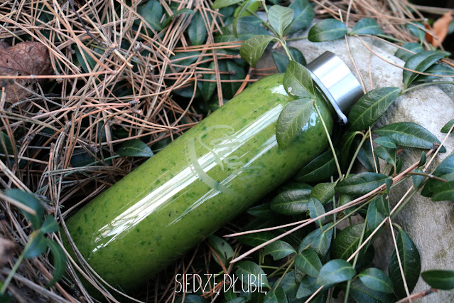 Ale największym problemem był wybór czym wypełnić butelkę. Wiadomo było, że powinno to być coś zielonego, ale niewiele jest zielonych napojów. Pomyślałam o oliwie, ale nie wiem czy An by z niej korzystała. Później przyszła mi do głowy jakaś zielona nalewka, ale podczas tych 20 lat znajomości z An nigdy niczego alkoholowego razem nie piłyśmy, a butelka bardziej jest przeznaczona do soków albo wody. Wtedy pomyślałam o koktajlu owocowo jarmużowym albo szpinakowym, ale nie mogłam znaleźć tych liści w okolicznych sklepach. W desperacji uznałam, że wleję do butelki syrop truskawkowy, który robiłam w zeszłym roku. Nie jest co prawda zielony, ale jego kolor bardziej przypomina kolor coli. Ale w końcu przypadkiem znalazłam jarmuż. Więc jest zdrowiej, bezcukrowo, dietetycznie i zielono! Tylko napis trochę gorzej widać.